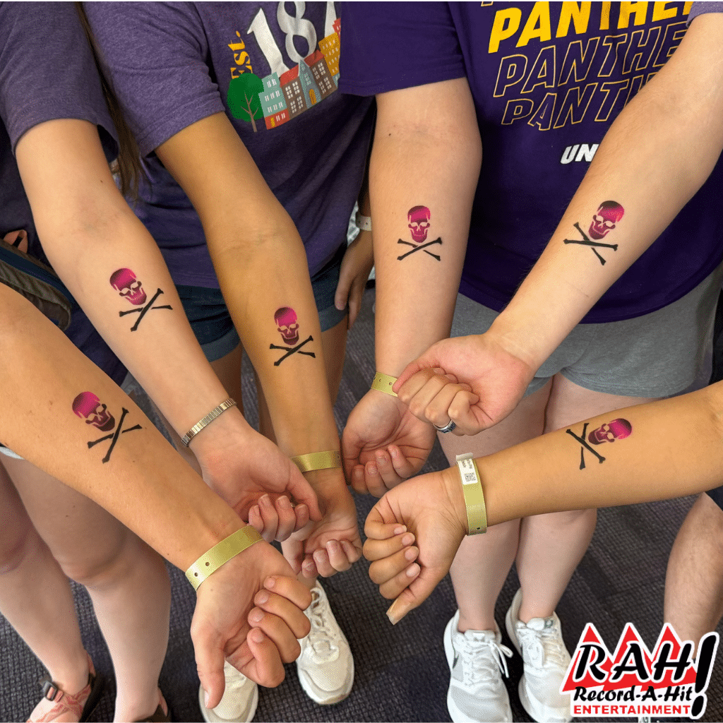 Airbrush Tattoos Artist is a fantastic option that can be enjoyed by anyone. Our Airbrush Tattoo Artist use multiple colors of washable body paint, an airbrush, and a huge selection of tattoo designs and stencils that guests can choose from. Custom stencils are available at an additional cost. Tattoos can be placed on a person’s hand, neck, arm, shoulder or leg. The airbrush tattoos are temporary and will last for a couple of days. They can be washed off with soap and warm water.