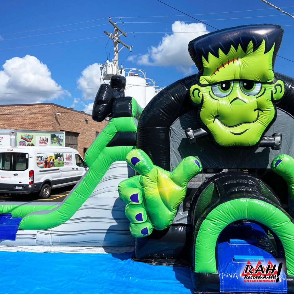 🎈🎃 Rent our inflatable Halloween-themed Frankenstein bounce house with slide combination for your next party or event.