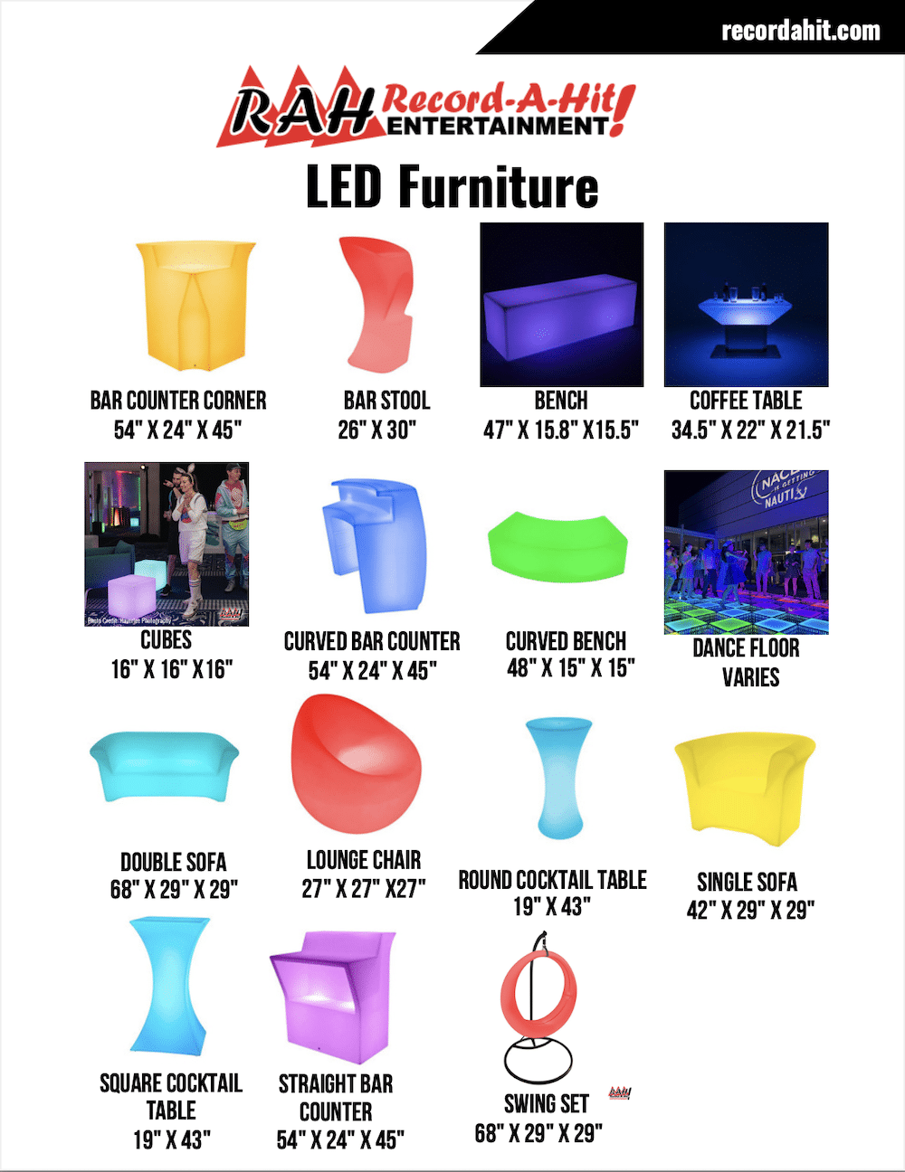 Create the perfect glow zone with our stunning LED furniture collection! From illuminated cocktail tables to glowing benches to radiant chairs and swing sets, this modern LED furniture adds a vibrant twist that elevates any venue!